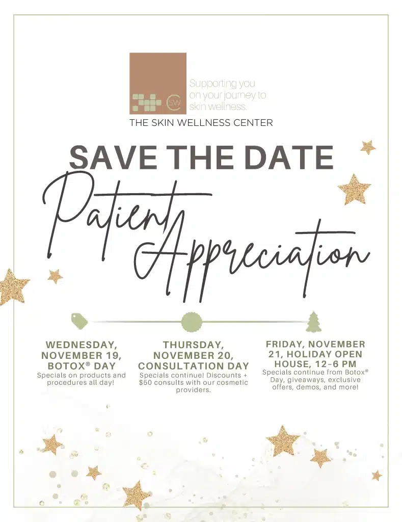 Join us at The Skin Wellness Center as we celebrate YOU—our fabulous patients! The festivities kick off with Botox® Day on Wednesday, November 19 and continue through Friday, November 21. Our Holiday Open House will take place from 12–6pm on November 21, 2025, with exclusive offers on Botox® Cosmetic, giveaways, goodie bags, and more. You won’t want to miss it!